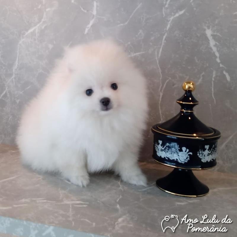 Essa fêmea branca de Lulu da Pomerânia é simplesmente de tirar o fôlego! Com o jeitinho de ursinha, focinho curtinho e uma pelagem branca, farta e super macia, ela parece saída de um conto de fadas. Extremamente delicada, carinhosa e com estrutura compacta, é perfeita para quem busca um pet exclusivo, de linhagem refinada e aparência encantadora.